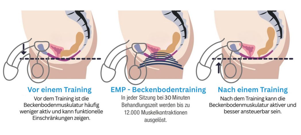 Das EMP-Beckenbodentraining nutzt ein pulsierendes elektromagnetisches Feld, das die Beckenbodenmuskulatur zu zahlreichen, sehr kräftigen Kontraktionen anregt. Diese sogenannten „supramaximalen Kontraktionen“ ähneln einem intensivierten Beckenbodentraining, ohne dass eigene Übungen erforderlich sind.