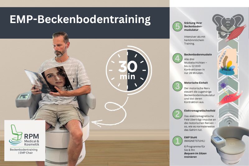 Hinweise: Das EMP-Beckenbodentraining ist ein präventives Angebot und ersetzt weder eine medizinische Behandlung noch eine ärztlich verordnete Physiotherapie. Vor Beginn – insbesondere im Zusammenhang mit einer Operation – sollte eine ärztliche Freigabe eingeholt werden. Einige Fachärzte sehen den Einsatz des EMP-Beckenbodenstuhls als sinnvolle Ergänzung zum klassischen Beckenbodentraining und empfehlen ihn auf Nachfrage als zusätzliches Training. Das verordnete Training auf Rezept sollte jedoch weiterhin regulär durchgeführt werden. Wer zusätzlich ein intensives, technikgestütztes Training nutzen möchte, um den Beckenboden gezielt zu stärken und möglicherweise schneller Fortschritte zu erzielen, kann das EMP-Beckenbodentraining beispielsweise bei RPM Medical & Kosmetik in Mönchengladbach in Anspruch nehmen.